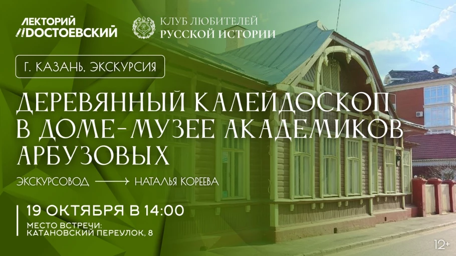 19 октября (воскресенье) Клуб любителей русской истории в Казани приглашает посетить экскурсионную программу «Деревянный калейдоскоп» в Доме-музее академиков Александра Ерминингельдовича и Бориса Александровича Арбузовых. Проведёт экскурсию заведующая музеем Наталья Сергеевна Кореева.