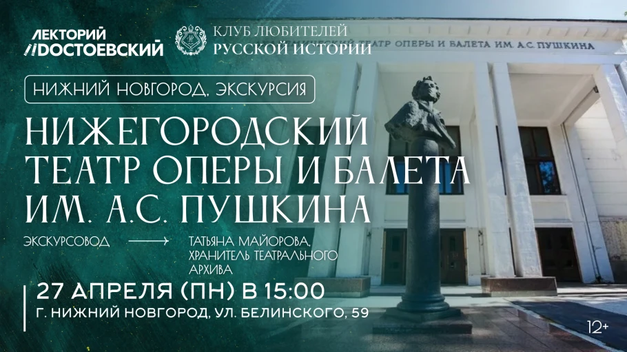 27 апреля Клуб любителей русской истории в Нижнем Новгороде приглашает на историческую экскурсию в Нижегородский театр оперы и балета им. А.С. Пушкина.