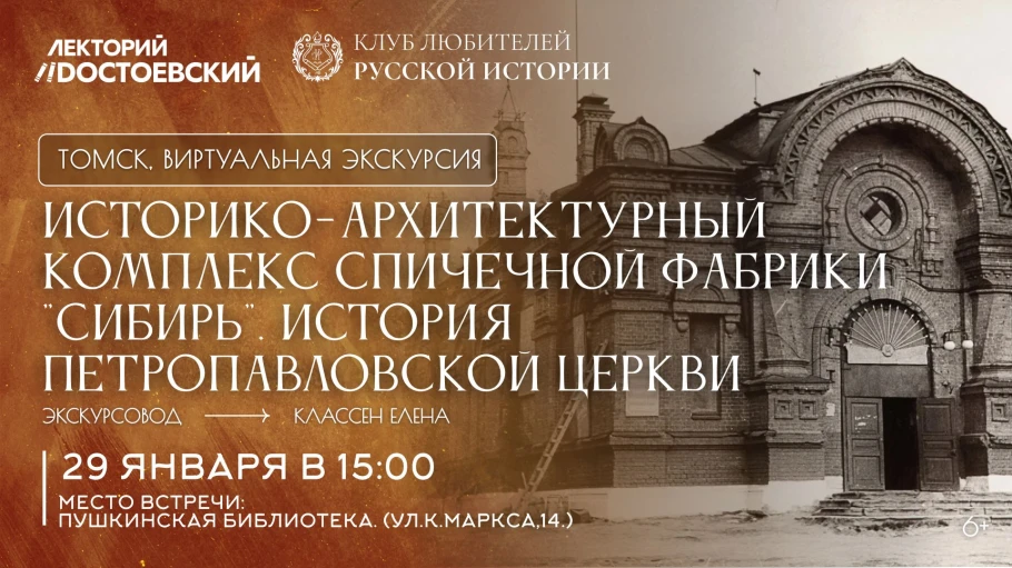 29 января Клуб любителей русской истории в Томске приглашает на виртуальную экскурсию "Историко-архитектурный комплекс спичечной фабрики «Сибирь» История Петропавловской церкви.»".