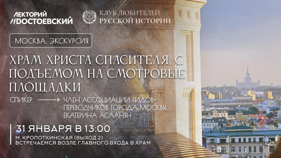 31 января Московское отделение Клуба любителей русской истории приглашает Вас на экскурсию в главный кафедральный собор Русской православной церкви, Храм Христа Спасителя, с подъемом на смотровые площадки и обзором панорамы города.