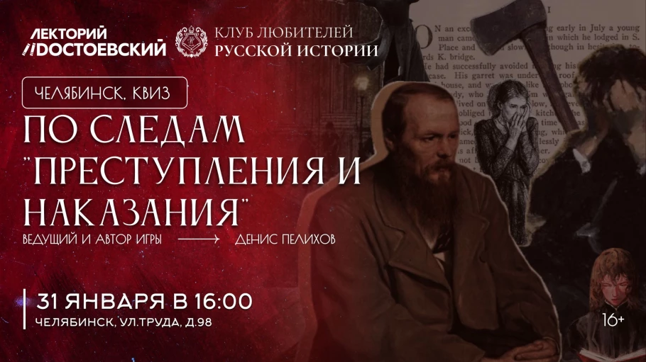 Челябинский клуб любителей русской истории совместно с кафедрой русского языка и литературы ЮУрГУ приглашают принять участие в квизе "По следам "Преступления и наказания". Квиз, посвящен 160-летию дня выхода в свет бессмертного романа Ф.М.Достоевского. Начальные главы этого произведения были напечатаны в первом номере журнала "Русский вестник" в 1866 году.