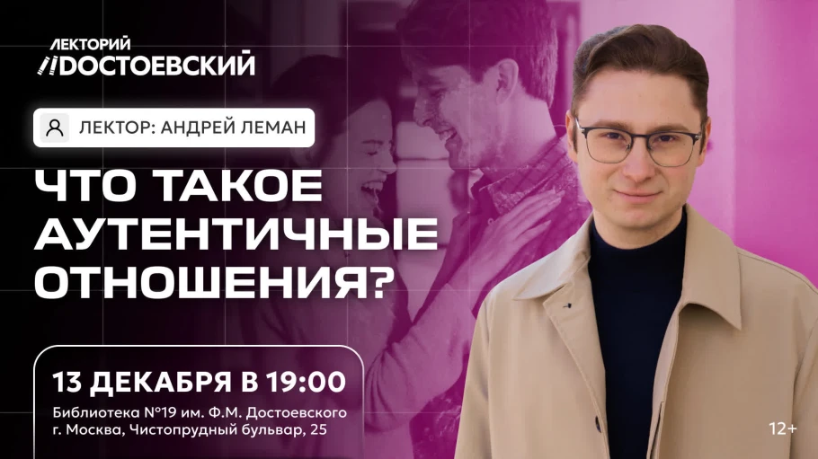 Об аутентичном отношении к другим и о противоположности этому, поговорит философский консультант, преподаватель и ведущий философского подкаста Андрей Леман на лекции, которая пройдет 13 декабря в Библиотеке №19 им. Ф.М. Достоевского по адресу г. Москва, Чистопрудный бульвар, 25