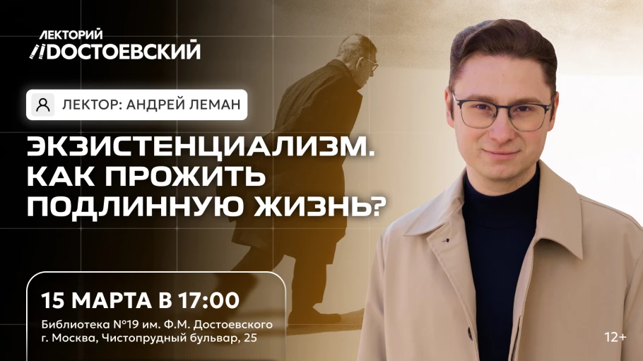 О том, что такое экзистенциальная этика и как нам прожить подлинную жизнь, поговорит философ, преподаватель, популяризатор и ведущий подкаста Андрей Леман на лекции, которая пройдет 15 марта в 17:00 в Библиотеке №19 им. Ф.М. Достоевского по адресу: г. Москва, Чистопрудный бульвар, 25.