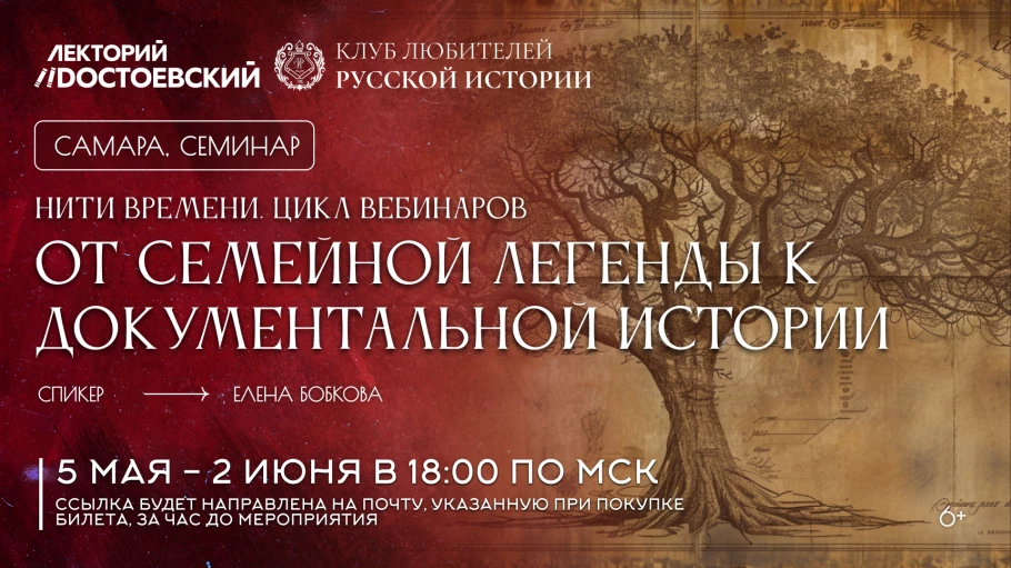 Четвёртый семинар "Контекст: история страны в судьбе человека" состоится 26 мая. На этой встрече научимся читать биографию предка сквозь призму эпохи. Методика ленты времени: сверху — события страны, снизу — события жизни. Результат: поймёте, как большая история повлияла на конкретного человека — Вашего предка. Полюбите историю не как школьный предмет, а как живое знание о том, откуда мы пришли.