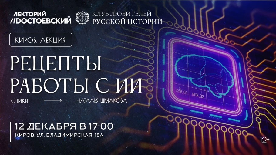 Что общего у вятского пряника и искусственного интеллекта? Оба вдохновляют, если знать рецепт. 12 декабря Клуб любителей русской истории приглашает на встречу “Рецепты работы с ИИ”. Соберёмся за чашкой чая, чтобы поговорить, как нейросети становятся настоящими напарниками.