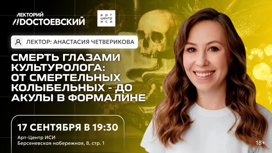 Приглашаем поразмышлять о смерти, а может быть, и разобраться со своим отношением к ней раз и навсегда вместе с культурологом и музыковедом Настей Четвериковой, автором популярного просветительского подкаста и книги «Искусство для пацанчиков», известной своей увлекательной манерой изложения и умением объяснять сложное простыми словами.