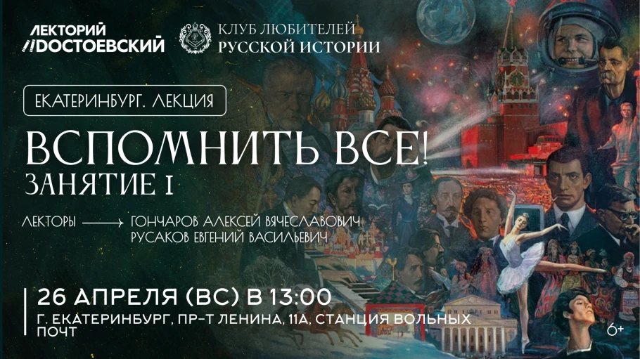 Часто ли вы ловите себя на мысли, что школьные уроки истории прошли мимо, а сейчас так важно понимать, как строилось наше прошлое? 26 апреля Клуб любителей русской истории в Екатеринбурге запускает курс “Вспомнить всё!” — проект для тех, кто хочет восстановить фундамент знаний и увидеть историю России как единую, захватывающую сагу.