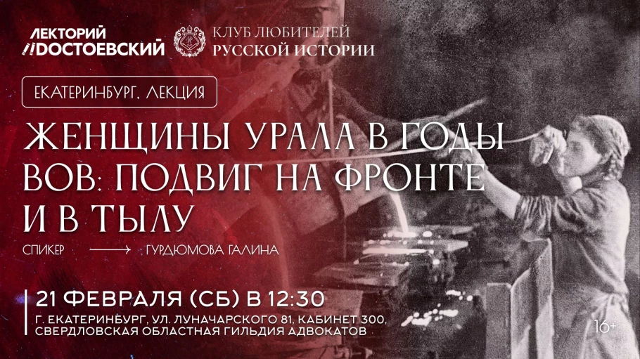 21 февраля Клуб любителей русской истории в Екатеринбурге приглашает на лекцию, посвященную невероятному вкладу уральских женщин в Победу в Великой Отечественной войне!
