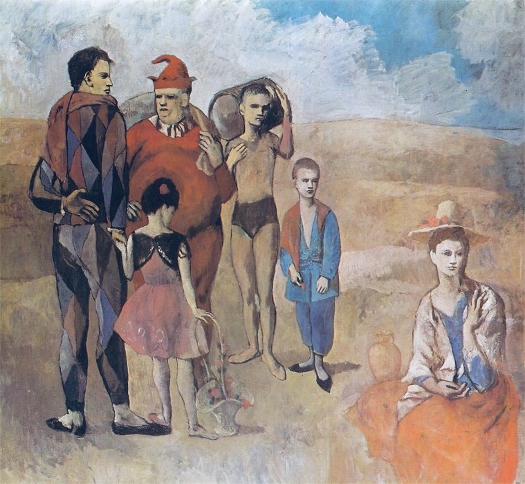 В этот период созданы картины «Трагедия», «Свидание» и другие. За ним Пикассо обратился к противоложному стилю и тематике, более радостным и ярким. Этот период назван розовым" и связан с его пребыванием в Париже (1904-1906гг). После переезда в этот город появились работы «Актёр», «Семья комедиантов» и другие.