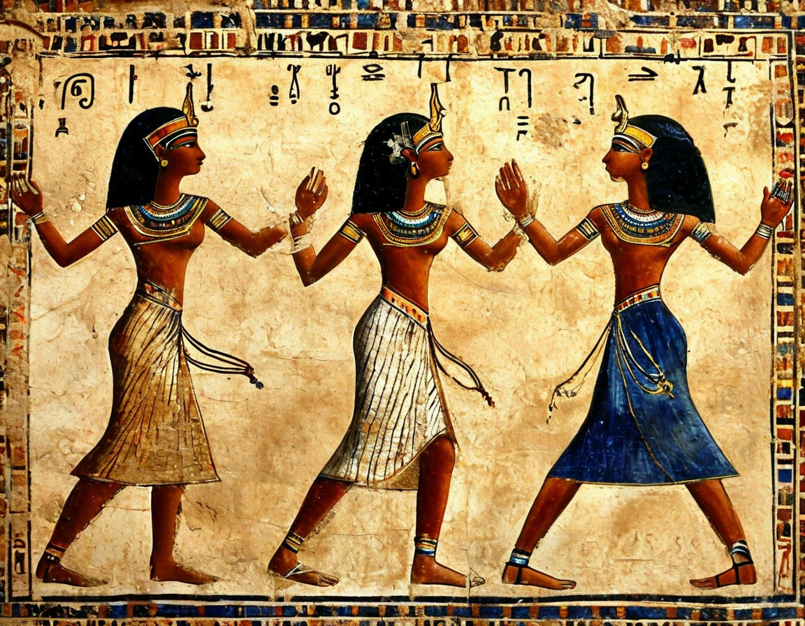 Так, археологические находки Древнего Египта (наскальные рисунки, росписи гробниц) свидетельствуют о развитой танцевальной культуре. Танцы были тесно связаны с религией: жрецы и исполнители ритуалов прославляли богов, распевая гимны и оды незримым силам. Существовали ритуальные танцы в честь божеств, погребальные ритуалы с участием специальных групп танцовщиц (например, «Дом акации»), а также танцы на празднествах и пирах. Движения были графичными, с элементами акробатики, часто строились по геометрическим фигурам (круг, квадрат, треугольник). Это, в общем, вполне передают египетские фрески.
