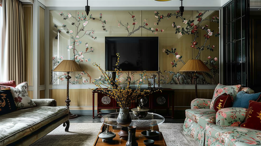 Вот и шинуазри - сплошь экзотика и фантазия, европейская интерпретация китайских мотивов. Европейские мастера создавали собственные произведения, вдохновлённые китайскими образцами, часто допуская культурные неточности. В качестве орнамента для обоев и принтов для драпировочных тканей применяют изображения птиц, цветов, драконов и других символов китайской культуры. Все здесь имеет свой смысл, все аллегорично. Любое изображение - не просто элемент эстетики, но деталь, несущая особый смысл. Цвета символизируют, к примеру, богатство и удачу (красный, золотой), а также элементы, связанные с природой (бамбук, цветы). Лакированная мебель, фарфор, шёлковые ткани — ключевые элементы стиля.