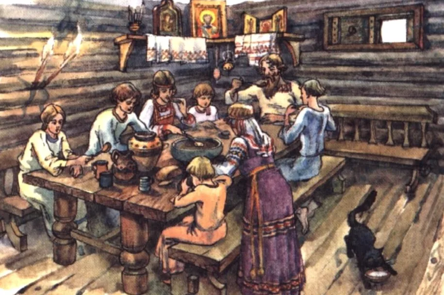 За столом издревле соблюдали принцип старшинства - так, у "верхнего" конца стола, под образами, сидел глава семьи. Справа от него - старший сын или следующий за хозяином старший член семьи или гость. Кстати, этот обычай сохраняется сегодня и у некоторых народов Кавказа и Закавказья.