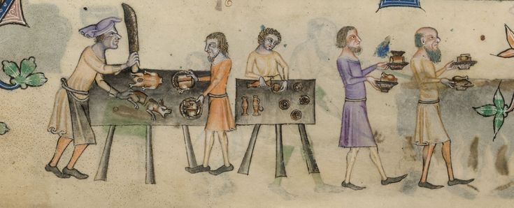 Каждый человек обычно приносил свой нож, которым нарезал пищу прямо за столом. Просить нож у хозяина считалось дурным тоном. Ложки в Средние века были не у всех, а вилки массово не прижились в Европе до позднего периода Средневековья. У знати столовые приборы (ложки, ножи) появились раньше, но они оставались роскошью