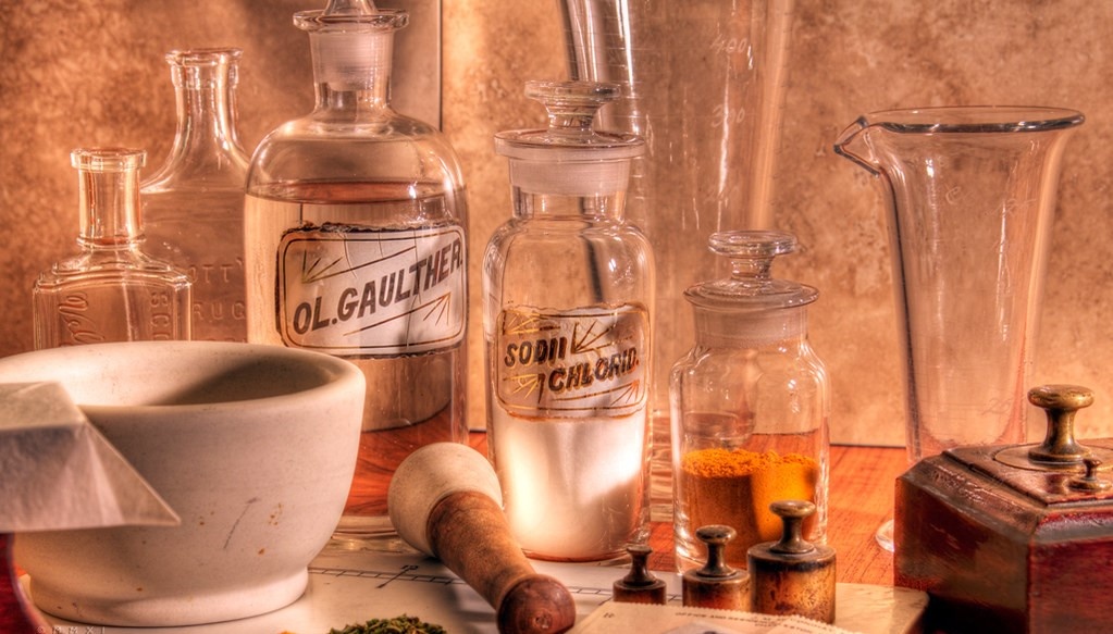 Сегодня в аптеке сохранились элементы дореволюционного интерьера: деревянные витрины, старинные колбы, пузырьки из-под микстур, банки-штангласы, ступки, каплемеры.