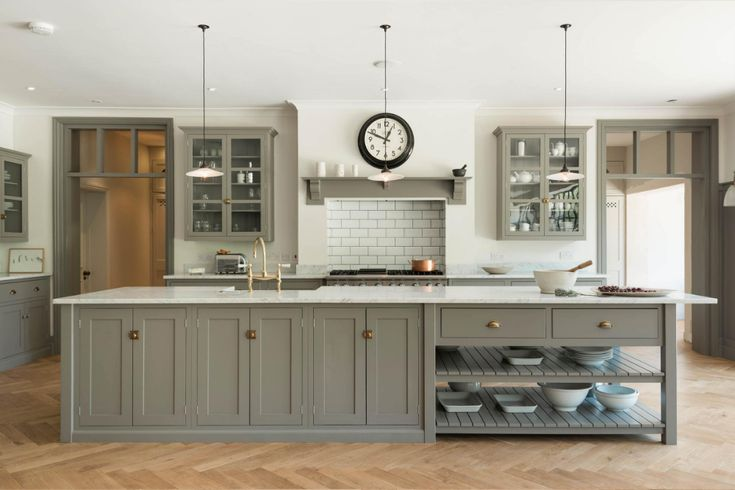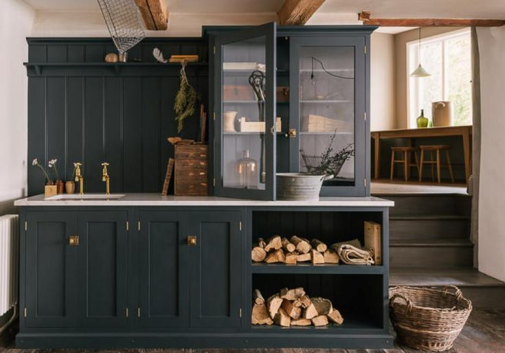 Они отличаются шкафами с простыми филёнками, открытыми полками, на которых расставлены керамические кувшины и тарелки, рейлингами с разделочными досками. Стилистику кухонных фасадов перенимают входные и межкомнатные двери, шкафы и гардеробные. По сути, это такой фермерско-пасторальный стиль, который близок провансу, но при этом, конечно, лишен чисто французской замысловатой эстетики.