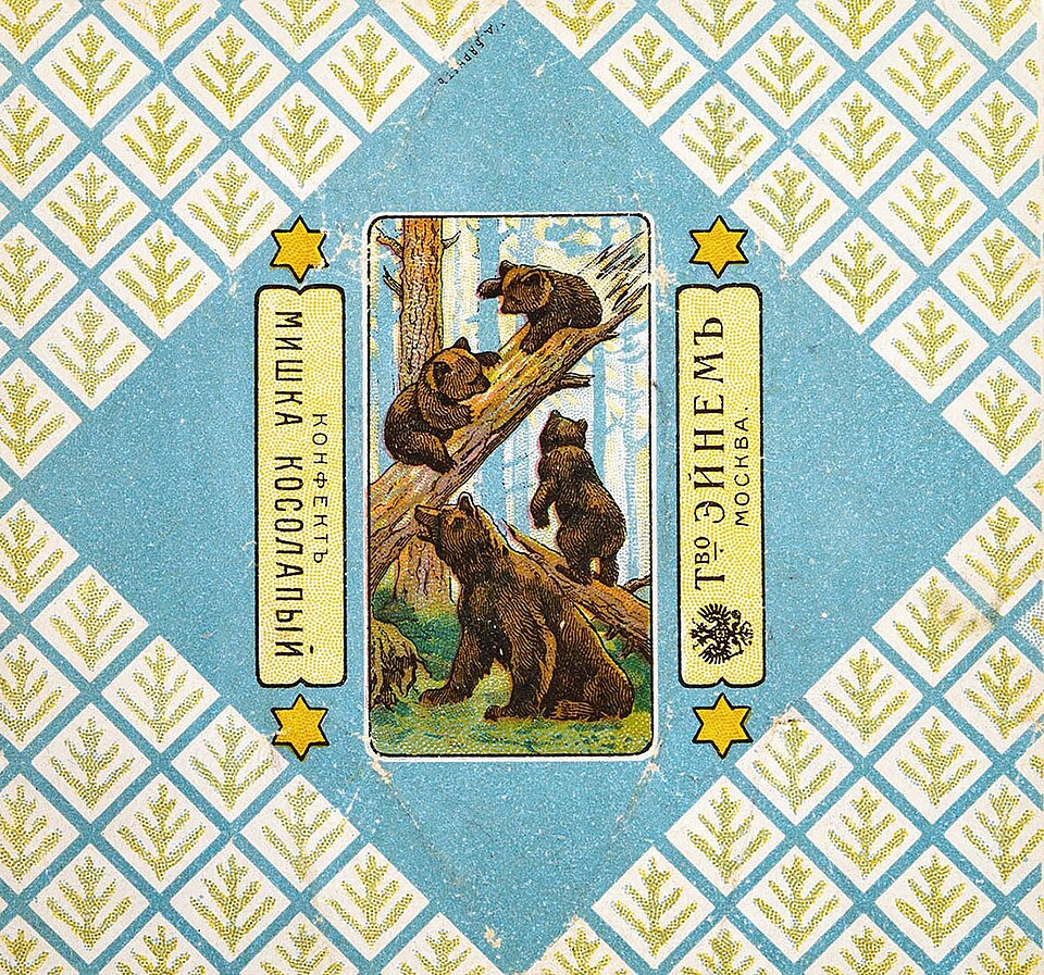 Художник Мануил Андреев создал дизайн упаковки, взяв за основу сюжет картины Шишкина. На фантике он изобразил медведей и пейзаж в вертикальном прямоугольнике, дополнив композицию вифлеемскими звёздами, логотипом фабрики с гербом царской России и орнаментом из ёлочек на голубом фоне. В 1920-х годах на обёртку нанесли агитационную надпись, сочинённую Владимиром Маяковским: «Если хочешь кушать „Мишку“, заведи себе Сберкнижку». В 1958 году упаковка с медведями завоевала гран-при на Всемирной выставке в Брюсселе.