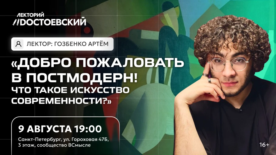 Что такое искусство современности? Это не просто вопрос, это целая вселенная, где смыслы распадаются и вновь собираются в неожиданные формы. На лекции у культуролога и философа Артёма Гозбенко вы погрузитесь в этот организованный хаос! Современное искусство — великое философское зеркало социальных, культурных и всех прочих декораций нашей жизни. Пост-мета-недомодерн выглядит так, как он выглядит, неспроста... Разберемся с вами, почему именно так!